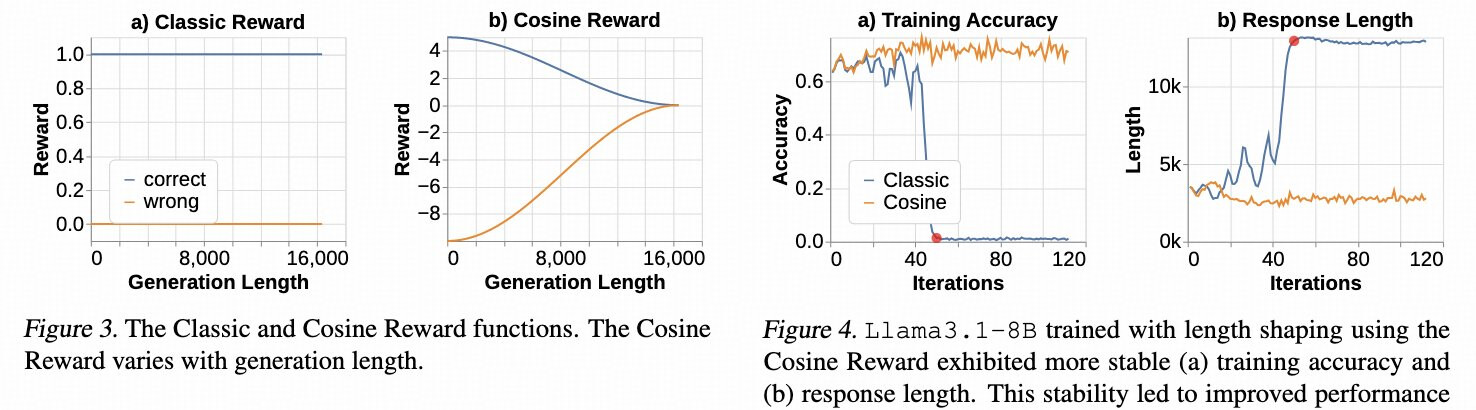 类似地,《揭秘 LLM 长链推理》 (Yeo 等人) 也研究了思维链 (CoT) 长度对效果的影响。他们搞了个 余弦奖励 (Cosine Reward),正确答案鼓励短 CoT,错的推长 CoT,稳住了 RL 训练,尤其在上下文长度有限、回答容易爆炸时。还有个 重复惩罚,模型要是为刷奖励在难题上重复废话,就罚它,逼它好好解题。