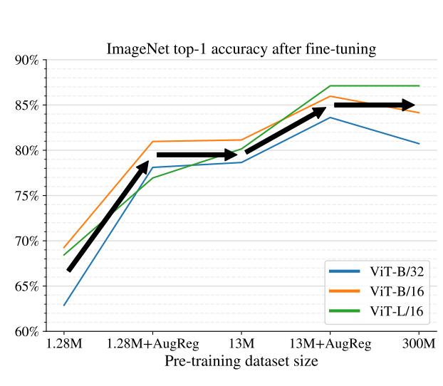 | 折线图展示了 ImageNet 模型在微调后的 Top-1 准确率表现。图中有四条不同颜色的线条: 蓝色、橙色、绿色和黑色。蓝色线条是四条线中最低的一条 ,它代表了表现最差的模型结果。 | |