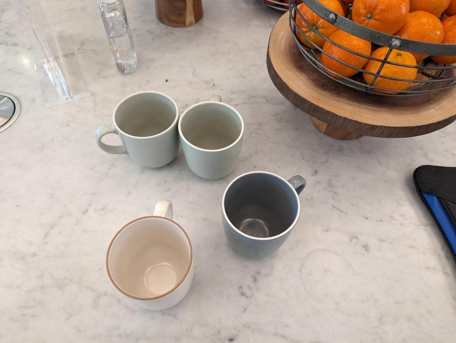 | 从上方俯瞰一张白色大理石台面,台面上放着四个咖啡杯。左边有两个灰色的杯子,左下角有一个白色的杯子,右侧则是另一个灰色的杯子。右上角放着一个带木质底座的金属水果篮,里面装满了橙子。左边还有一个装有水的透明玻璃水壶,画面中仅显示了部分内容。 | |