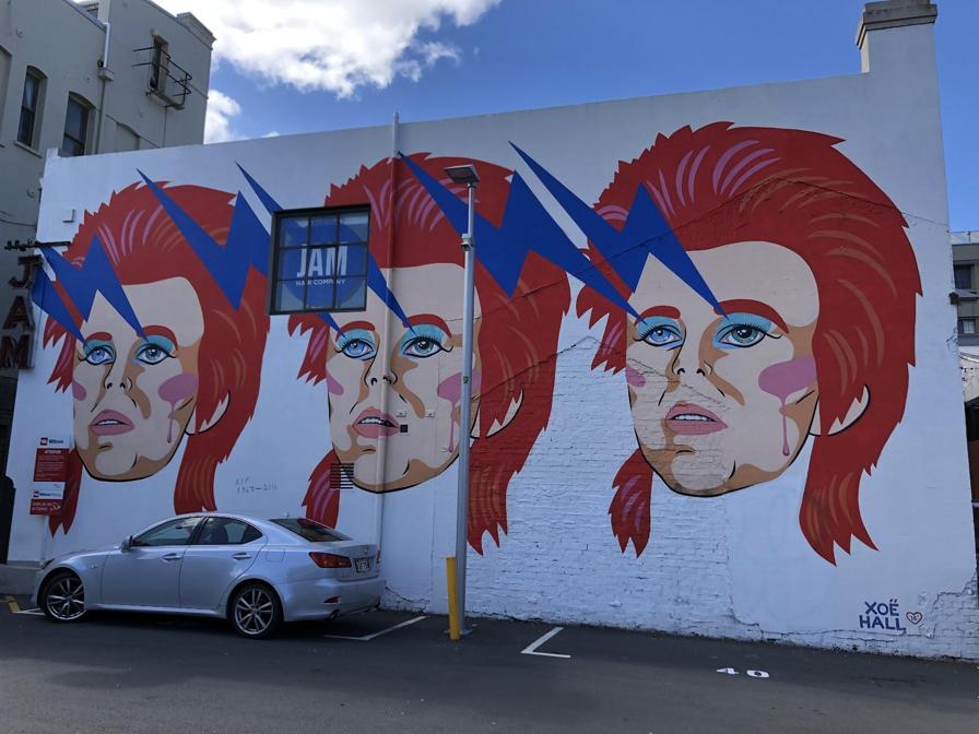 | 一幅描绘大卫·鲍伊“Ziggy Stardust”造型的壁画被画在一面白墙上。壁画展示了三张并排的面孔,每张都有红色的头发,眼睛上画着蓝色的闪电图案。面孔的妆容包括蓝色眼影、粉红色腮红和红色嘴唇。中间的面孔上方有一个黑色的方形窗口,窗口内用白色文字写着 “JAM”,字体为蓝色。画面的一侧停着一辆银色汽车。 | |