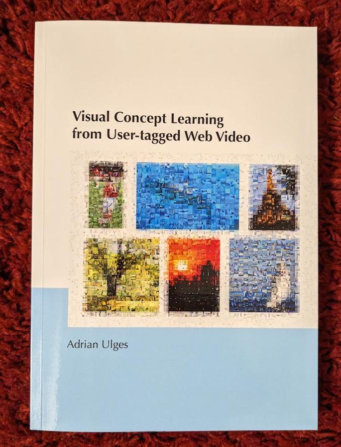 | 一张白色书本的特写,上半部分是白色区域,底部有一条蓝色条纹。白色部分印有黑色文字,内容为: “Visual Concept Learning from User-tagged Web Video” 。黑色文字下方有一个白色框,框内包含五张小图片。最左边的图片是一名站在草地中的人,右侧紧接的是一张蓝色海洋的图片。 |