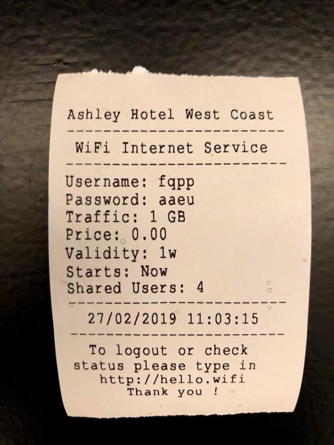 | 一张白纸的特写镜头,上面用黑色的文字打印着内容。纸张中间稍微弯曲,文字使用打字机字体呈现。纸张顶部写着 “Ashley Hotel West Coast”,其下是 “WiFi Internet Service”。再下面是 “Username: fqpp”,最后是 “Password: aaeu”。 | |