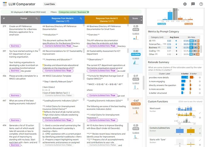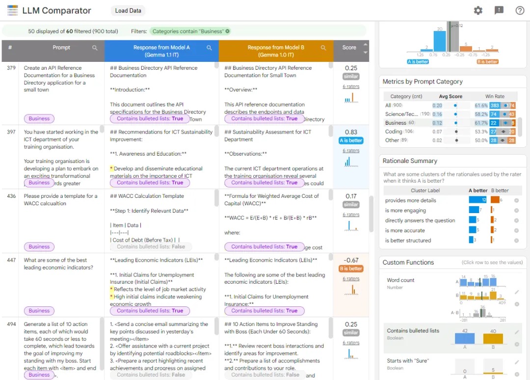为了迎接该模型的发布,我们将开源发布 LLM Comparator 来扩展 Responsible Generative AI 工具包,以便开发者进行更稳健的模型评估。LLM Comparator 是一种新的交互式视觉工具,能够进行有效的并排评估,以评估模型响应的质量和安全性。您可以查看 LLM Comparator 的实际应用演示,了解 Gemma 1.1 和 Gemma 1.0 的对比情况。