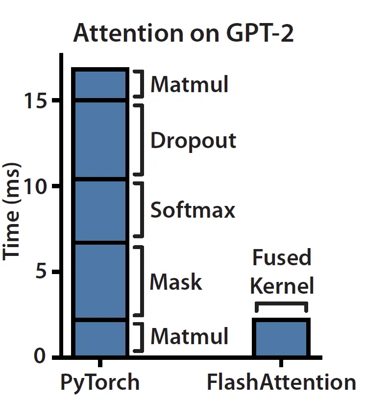 根据博文 根据第一性原理让深度学习性能起飞,我们可以发现,当前硬件上的注意力模块是 内存带宽受限 的。原因是注意力机制 主要由逐元素操作 组成,如下左图所示。我们可以观察到,掩码、softmax 和 dropout 操作占用了大部分时间,而非需要大量 FLOP 的矩阵乘法。