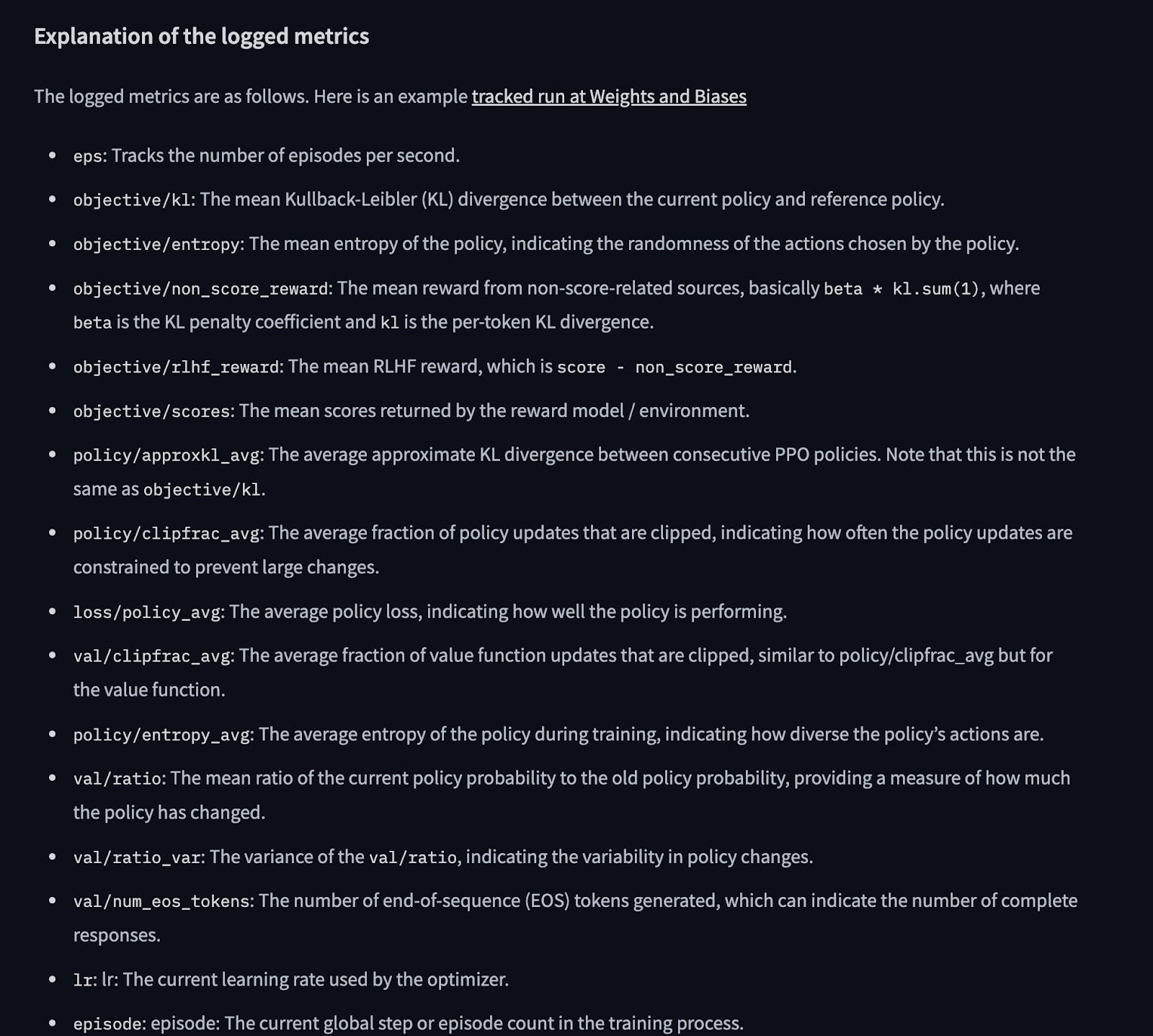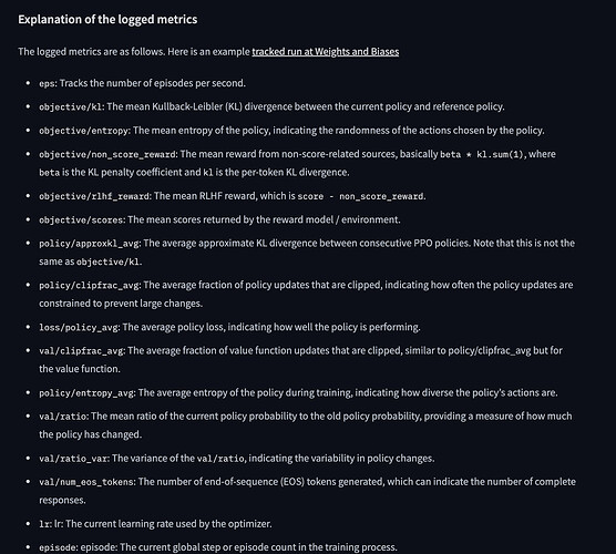 在编写 RLOO 和 PPOv2 实现时,我们强调使模型开发的透明度更容易提升。特别是,我们已经增强了文档,包括对记录指标的解释以及阅读和调试这些指标的操作指南。例如,我们建议在训练期间密切监控 objective/rlhf_reward,这是 RLHF 训练的最终目标。
