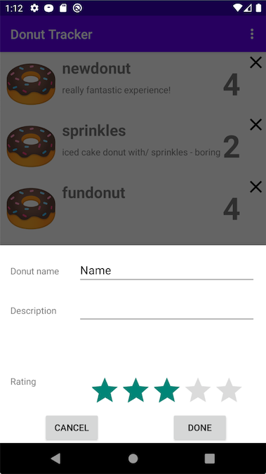 Donut Tracker 会显示甜甜圈的列表,每个列表项含有名称、描述和评分信息,这些内容有些是我添加的,有些是通过在点击 悬浮操作按钮 (FAB) 弹出的对话框中填写的。