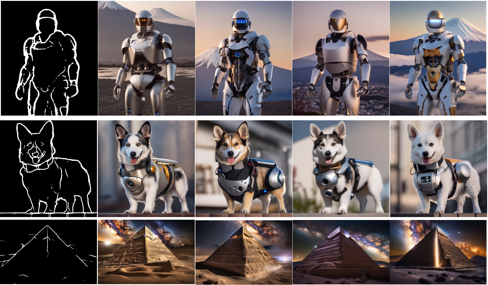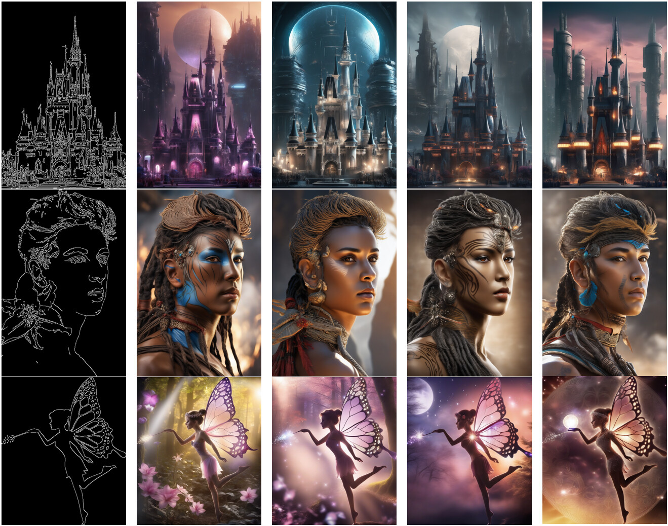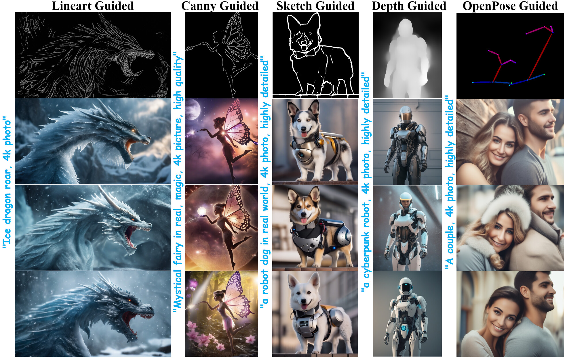 下面,我们展示了使用不同控制图像作为条件获得的结果。除此以外,我们还分享了相应的预训练 checkpoint 的链接。如果想知道有关如何训练这些模型的更多详细信息及其示例用法,可以参考各自模型的模型卡。
