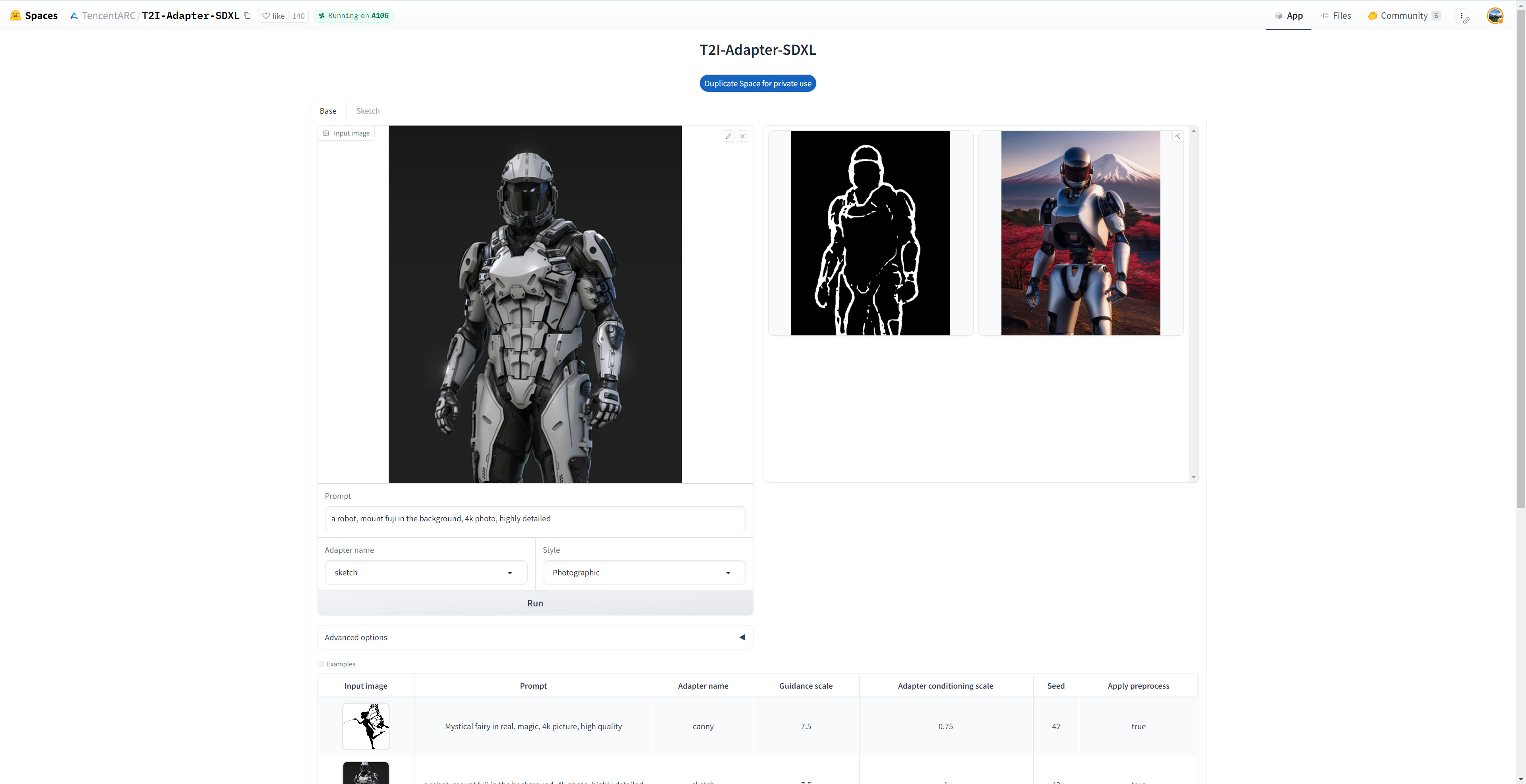 你可以在 这儿 或下述嵌入的游乐场中轻松试玩 T2I-Adapter-SDXL: