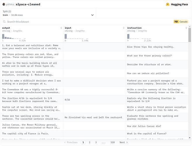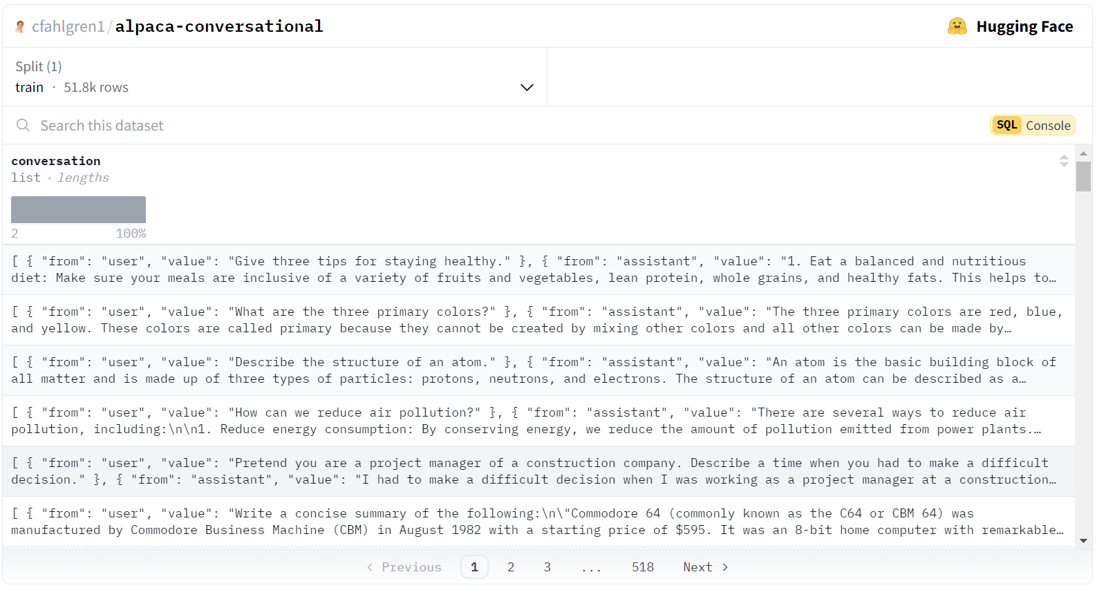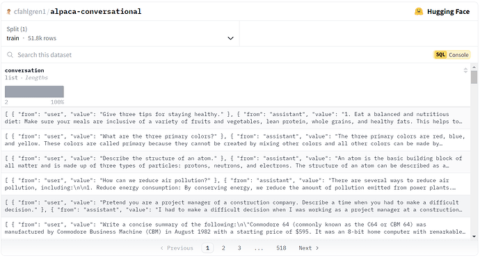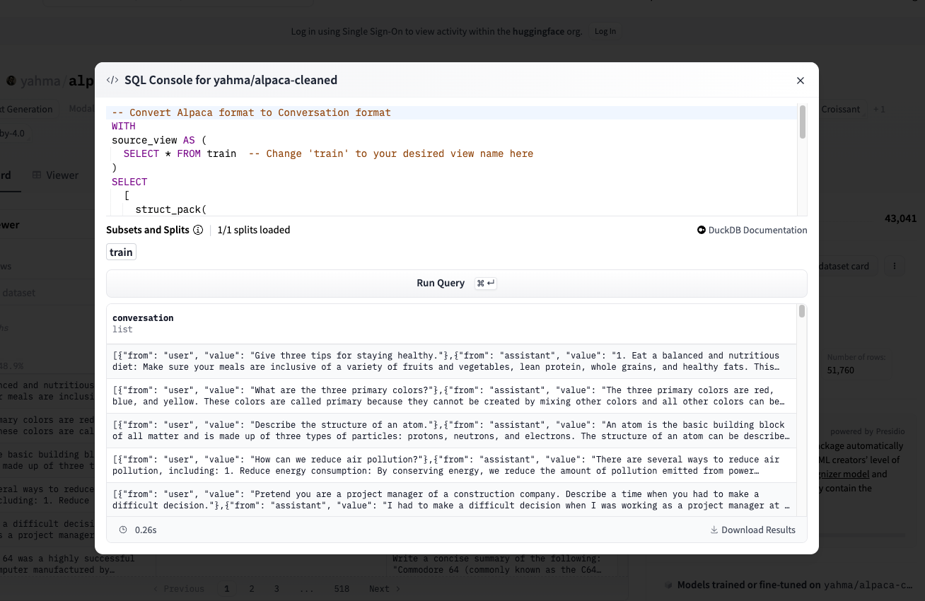 现在我们已经介绍了 SQL 控制台,让我们通过一个实际例子来实践一下。当微调大型语言模型时,我们经常需要处理不同的数据格式。其中特别流行的一种格式是对话式格式,在这种格式中,每一行代表用户与模型之间的多轮对话。SQL 控制台可以帮助我们高效地将数据转换为这种格式。让我们看看如何使用 SQL 将 Alpaca 数据集转换为对话式格式。