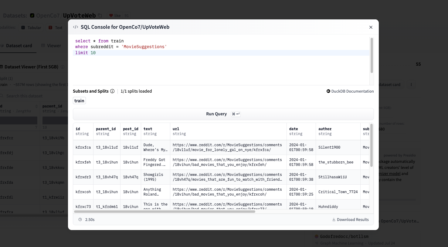 以下是对 OpenCo7/UpVoteWeb 数据集的查询,该数据集经过 Parquet 格式转换后有 12.6M 行。