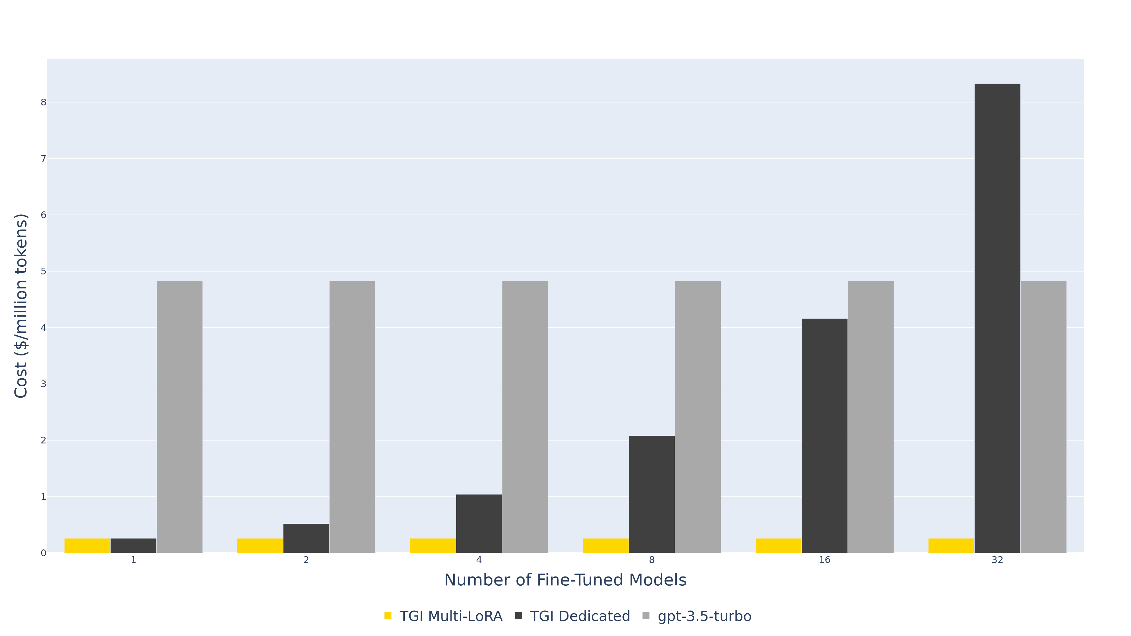 多-LoRA 服务的一大好处是, 无需为多个模型进行多次部署,因此要便宜得多。这与直觉相符,因为多模型部署要加载所有权重,而不仅仅是小小的适配器。如图 5 所示,当使用 TGI 多-LoRA 时,即使添加更多模型,每个词元的成本也是相同的。但如果不使用多-LoRA,每多部署一个微调模型,TGI 的成本就会随之线性增加。