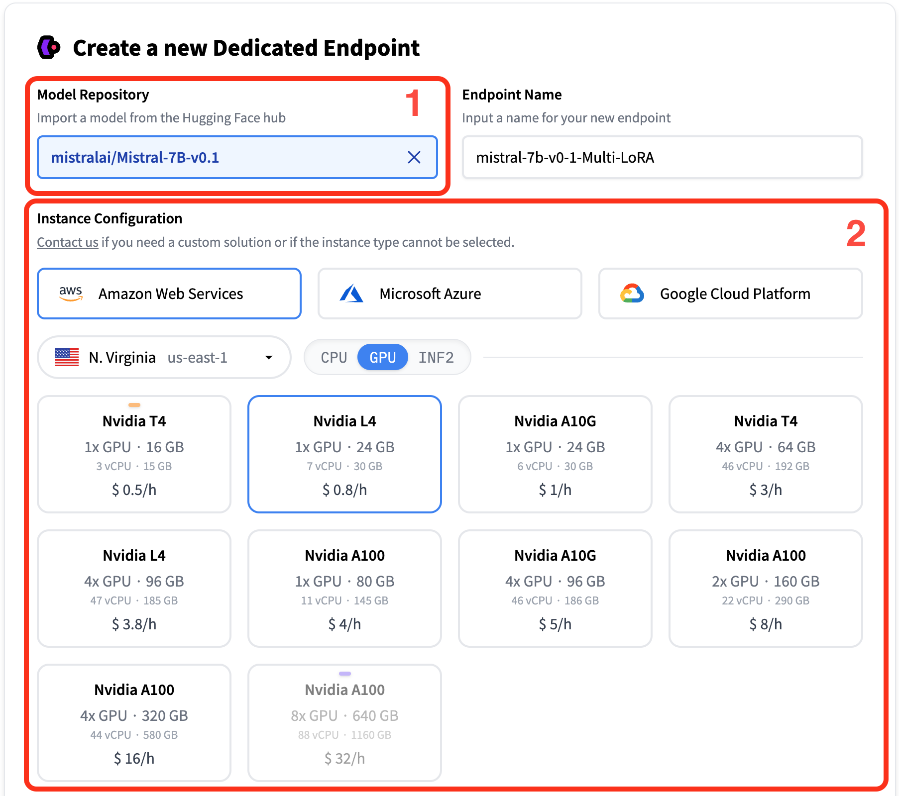推理终端 支持多种 GPU 或其他 AI 加速卡,只需点击几下即可跨 AWS、GCP 以及 Azure 部署!使用 GUI 部署相当容易。其后端默认使用 TGI 进行文本生成 (你也可以 选择 使用自己的 docker 镜像)。