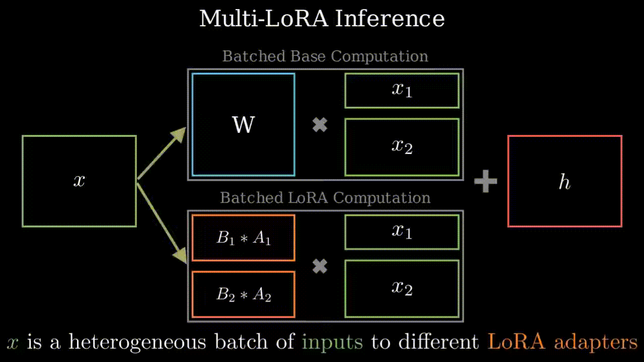 了解了 LoRA 的低阶适配的基本思想后,我们可以深入研究一下多-LoRA 服务了。这个概念很简单: 给定一个基础预训练模型和一些任务,你可以针对这些任务微调特定的 LoRA,多-LoRA 服务是一种根据传入请求动态选择所需 LoRA 的机制。