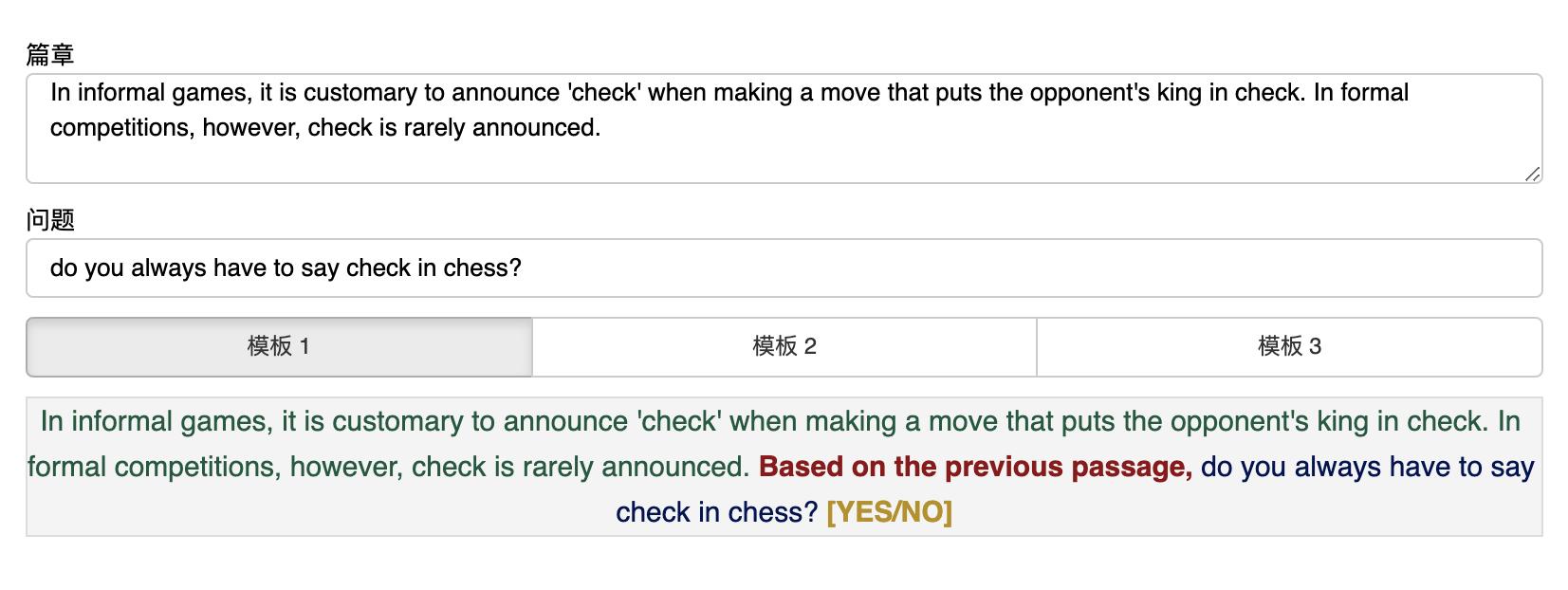 以下是 SuperGLUE 中的 BoolQ 任务的示例,其题型为判断题,每条数据包括一个文本 passage 及其对应的问题 question ,其答案为布尔值,要么为真,要么为假。每条数据可以和 模板(pattern) 一起组装成一个文本序列,该序列只有一个需预测的 掩码词。预测出该掩码词后,预测词会被一个预设的 言语器(verbalizer) 转换为类,也就是说言语器负责输出词与类别之间的映射:比较该词被映射为 真 和 假 的概率,如果 真 的概率高,则最终预测为真,反之则为假。