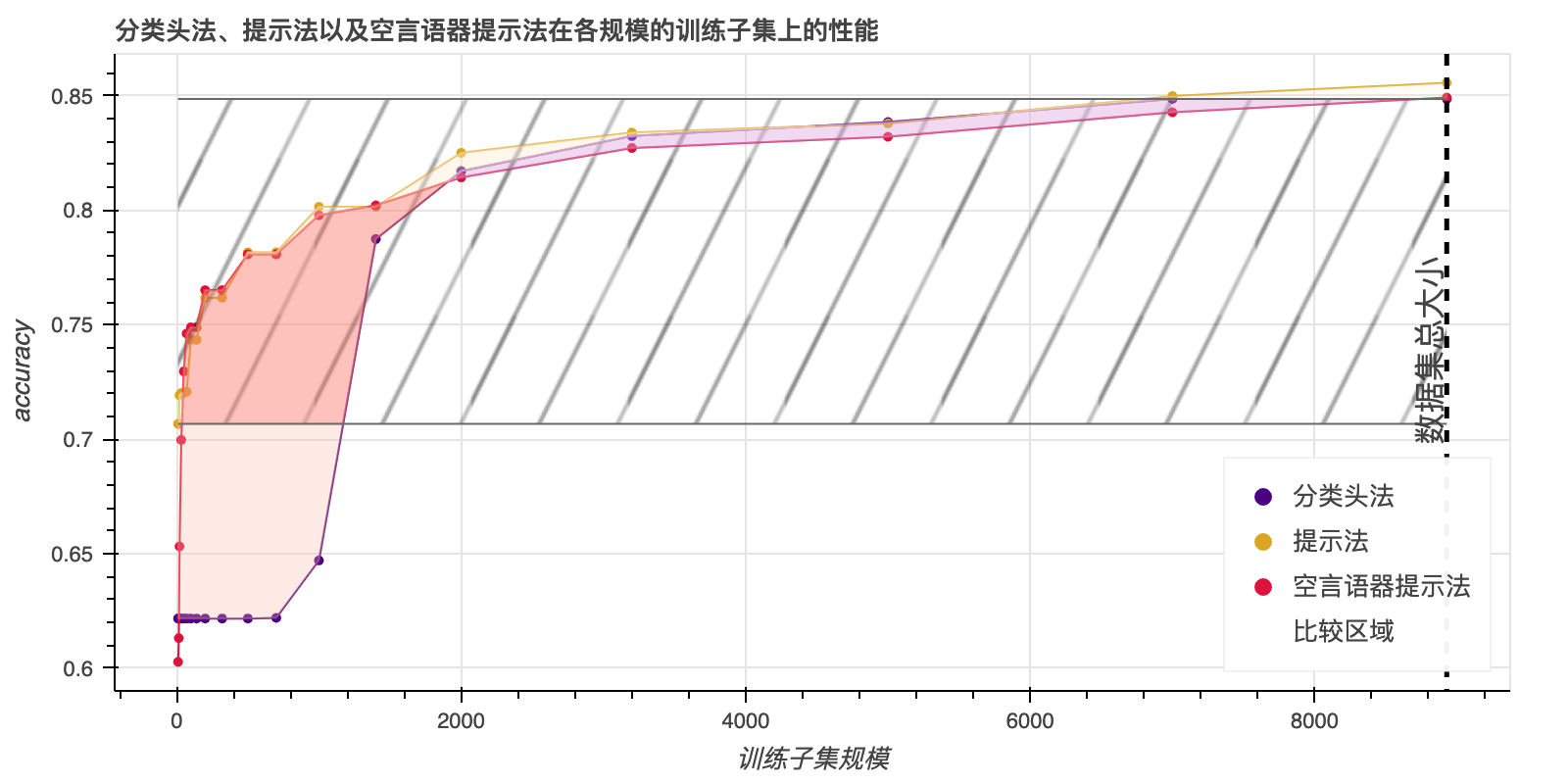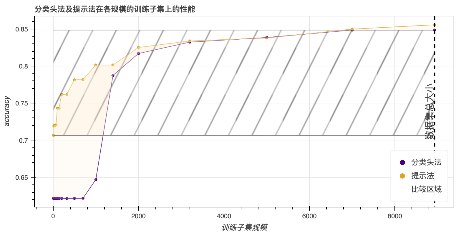 数据点(data points)通常用于描述单个信息单位或观测值,在本文中,它被用来量化“提示词”方法相对于传统方法的效率和效果。文章比较了两种训练(微调)机器学习模型的方法:一种是使用提示 (prompts),本文也称之“提示词”,另一种是使用传统的分类器头 (classifier heads),本文也称之为“分类头”。通过比较可以发现,使用提示词的方法通常比使用分类器头的方法更好。