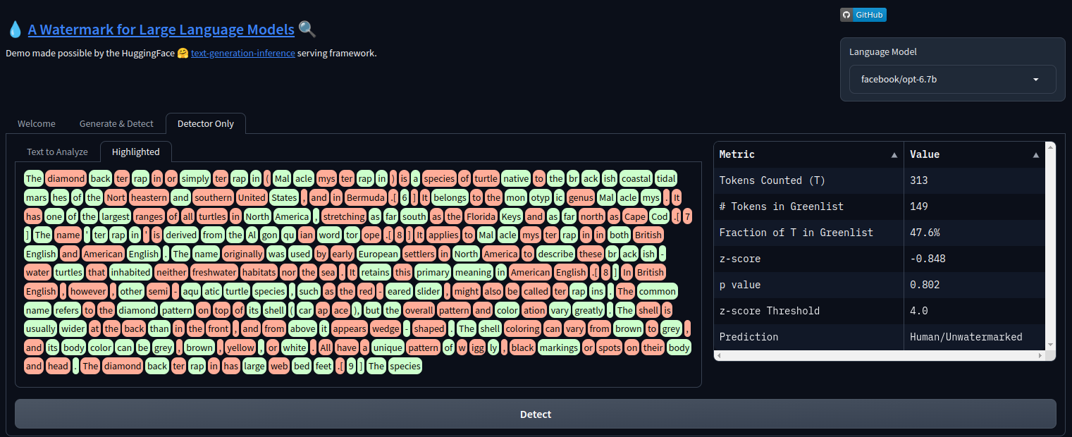 你可以在 Hugging Face Hub 上轻松实现 LLM 的水印。LLM 水印 Space(见图 3)演示了这一点,使用了 LLM 水印方法 对模型如 OPT 和 Flan-T5 进行了应用。对于生产级工作负载,你可以使用我们的 文本生成推理工具包,它实现了相同的水印算法,并设置了 相应的参数,可以与最新模型一起使用!