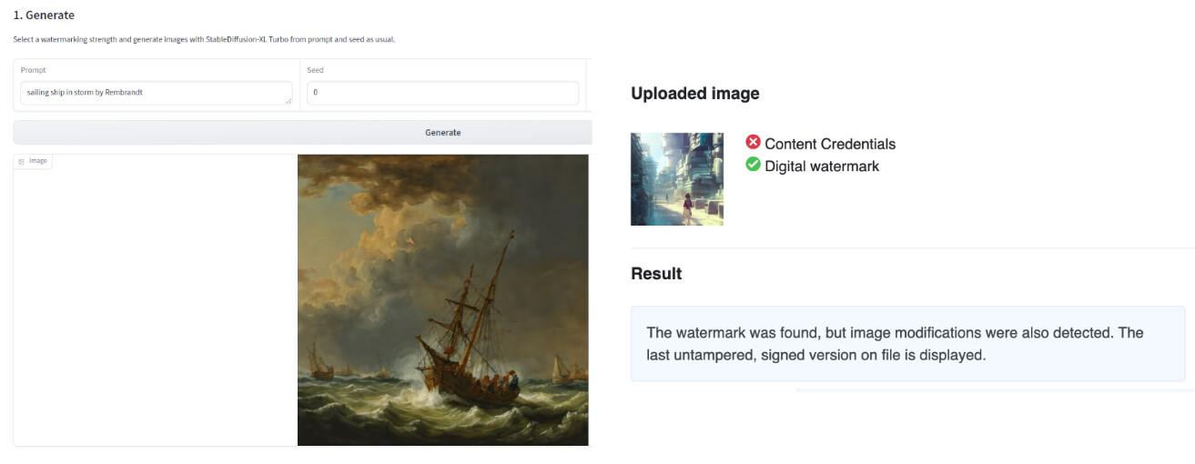 关于水印输出图像,Hub 上提供了两种互补的方法:IMATAG(见图 2),它通过利用修改过的流行模型(如 Stable Diffusion XL Turbo)在内容生成过程中实施水印;以及 Truepic,它在图像生成后添加不可见的内容凭证。