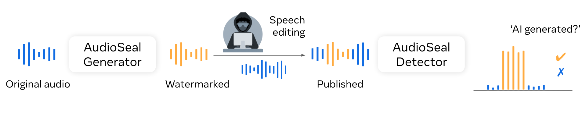 来源:GitHub - facebookresearch/audioseal: Localized watermarking for AI-generated speech audios, with SOTA on robustness and very fast detector