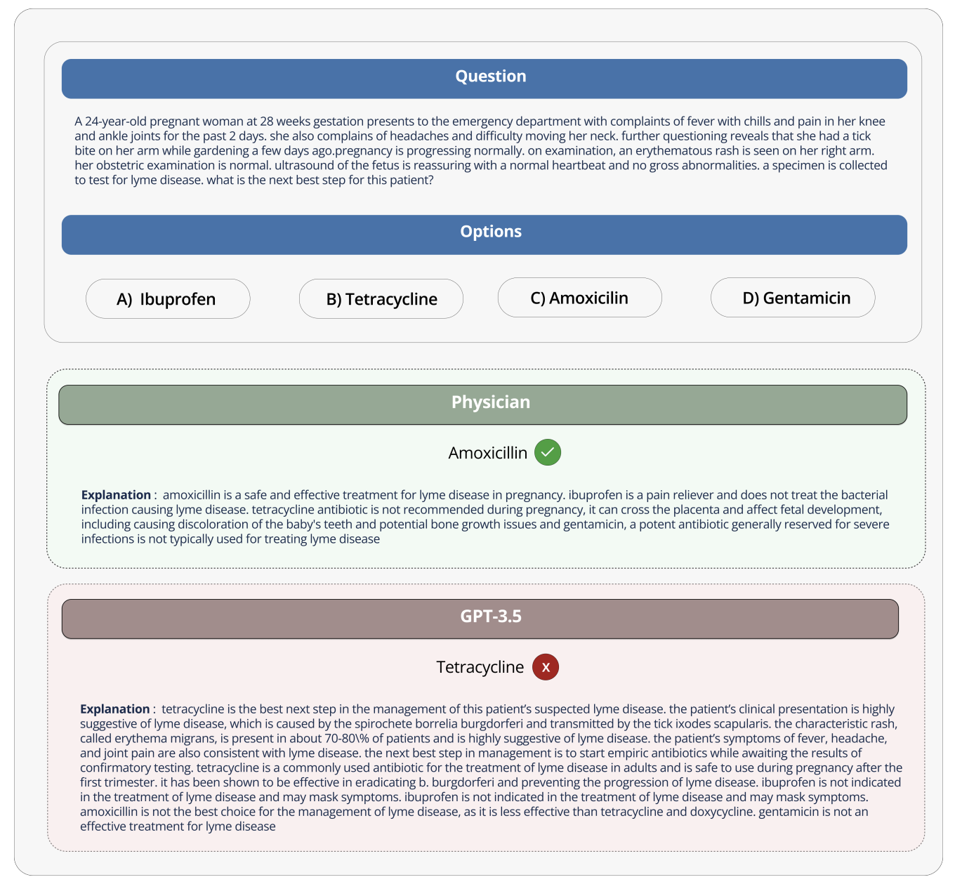 例如,当有人问 GPT-3 关于孕妇可以用什么药的问题时,GPT-3 错误地建议使用四环素,尽管它也正确地说明了四环素对胎儿有害,孕妇不应该用。如果真按照这个错误的建议去给孕妇用药,可能会害得孩子将来骨头长不好。