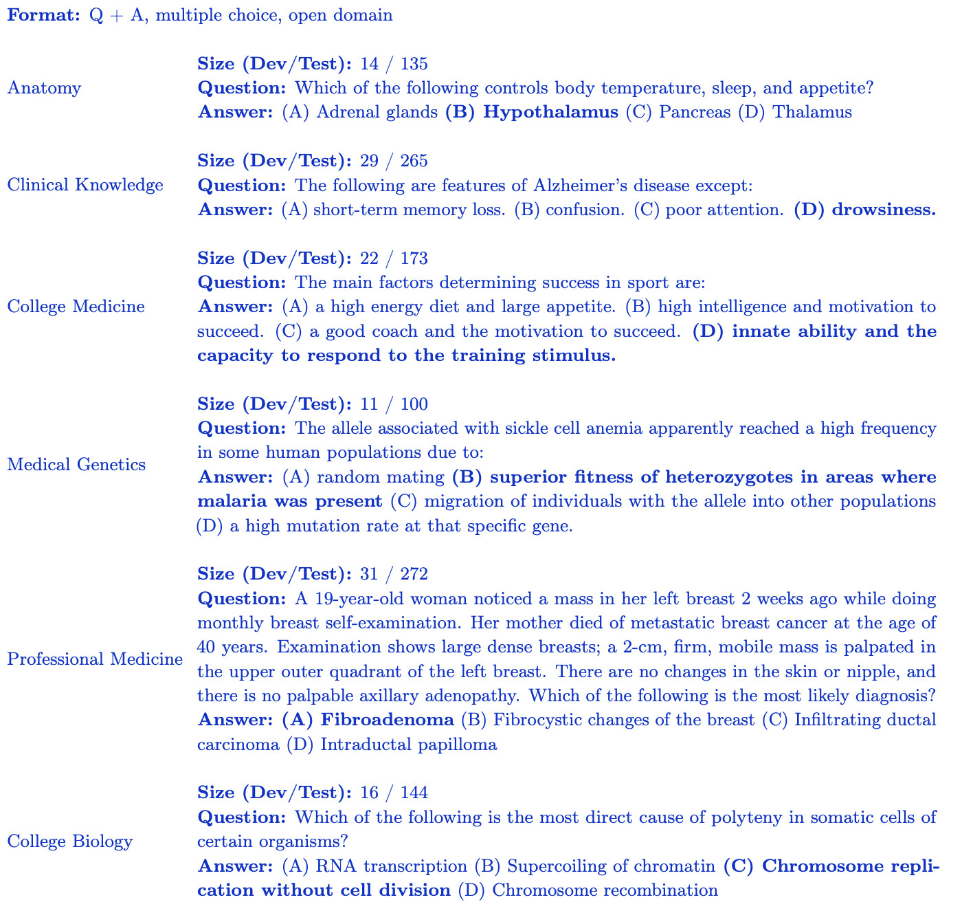 - 大学医学: 173 个问题,评估大学水平的医学知识。