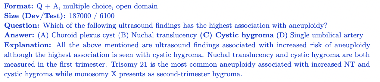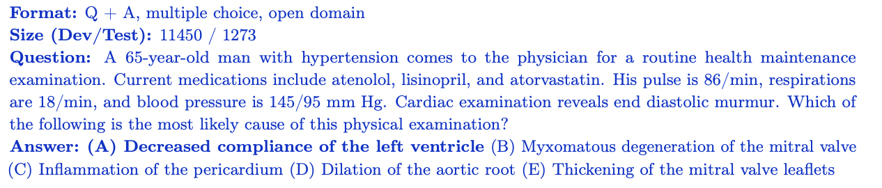 MedQA 数据集包含来自美国医学执照考试 (USMLE) 的多项选择题。它覆盖了广泛的医学知识,并包括 11,450 个训练集问题和 1,273 个测试集问题。每个问题有 4 或 5 个答案选项,该数据集旨在评估在美国获得医学执照所需的医学知识和推理技能。