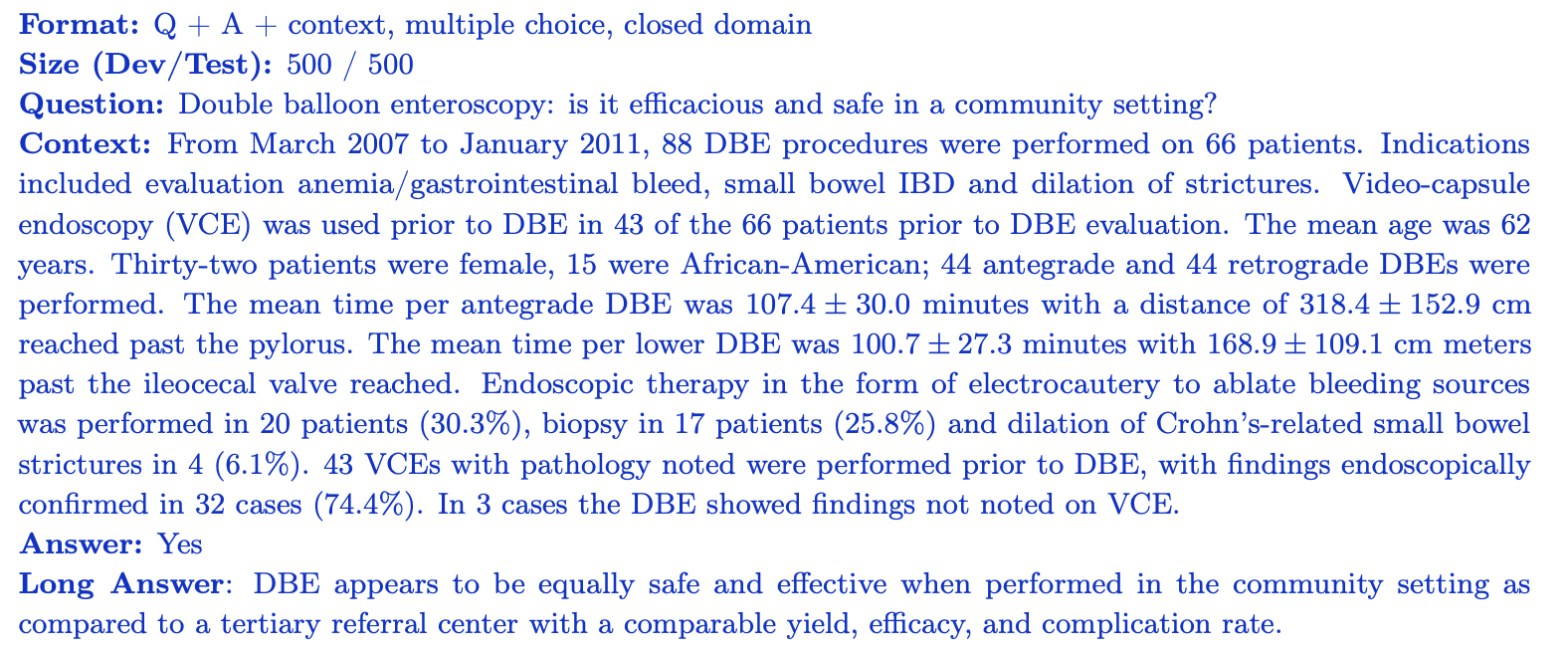 PubMedQA 是一个封闭领域的问答数据集,每个问题都可以通过查看相关上下文 ( PubMed 摘要) 来回答。它包含 1,000 个专家标注的问题 - 答案对。每个问题都附有 PubMed 摘要作为上下文,任务是提供基于摘要信息的是/否/也许答案。该数据集分为 500 个训练问题和 500 个测试问题。PubMedQA 评估模型理解和推理科学生物医学文献的能力。