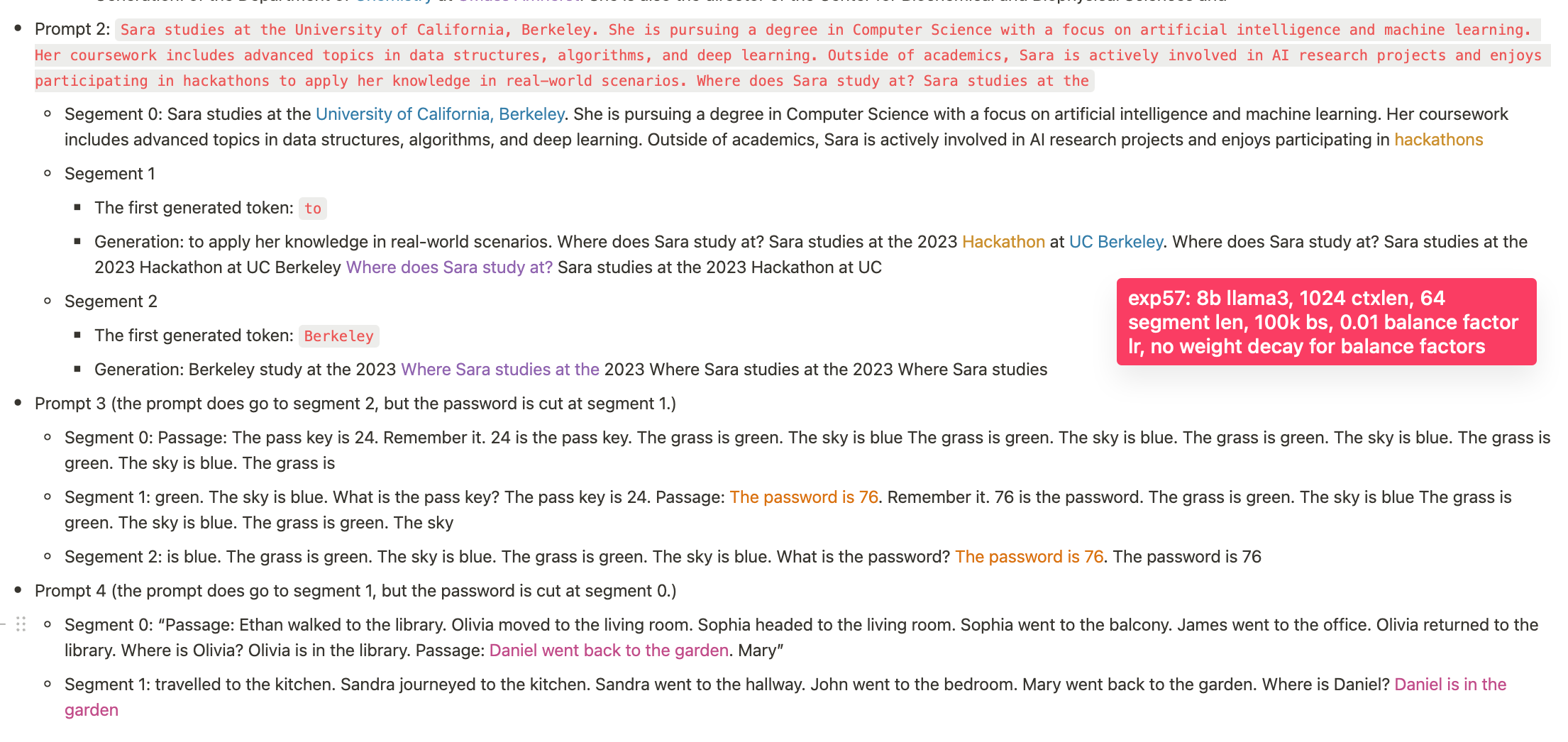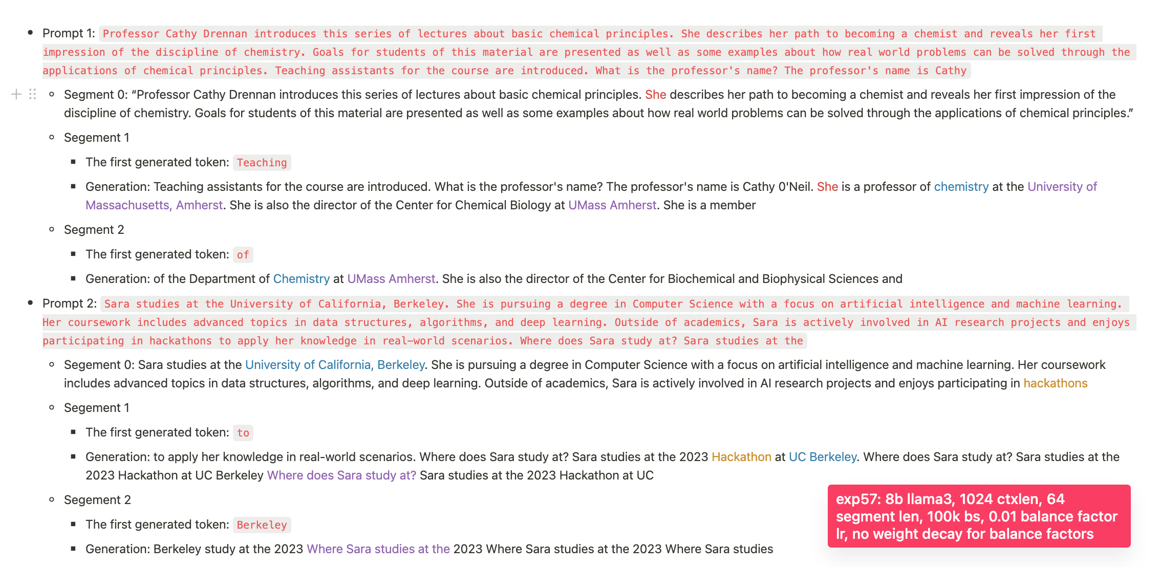如你所见,这在某种程度上是有效的。观察样本生成可以发现,Infini-attention 生成的内容与先前段落相关。