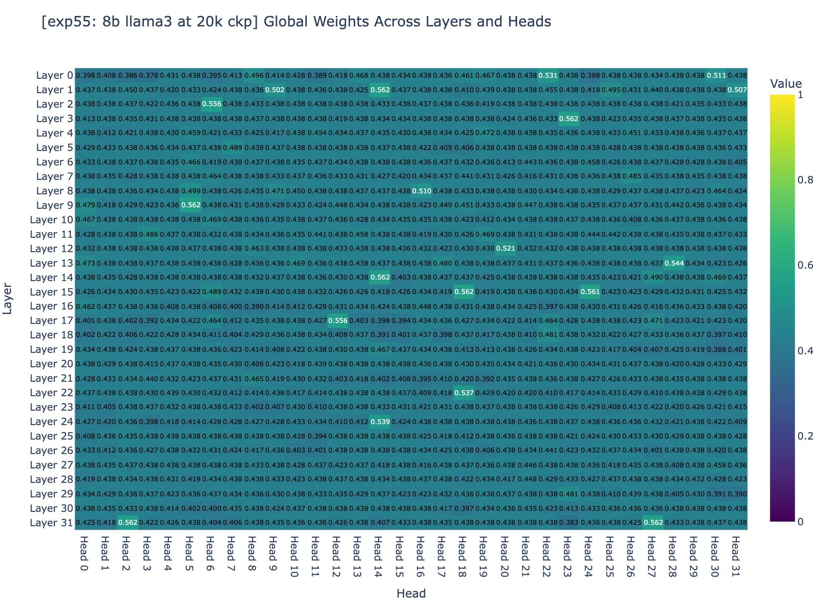 再次详细检查平衡因子,我们看到了一些进展: 现在约 95% 的头显示全局权重在 0.4 到 0.5 之间,没有头的全局权重大于 0.6。但权重仍然不在理想范围内。