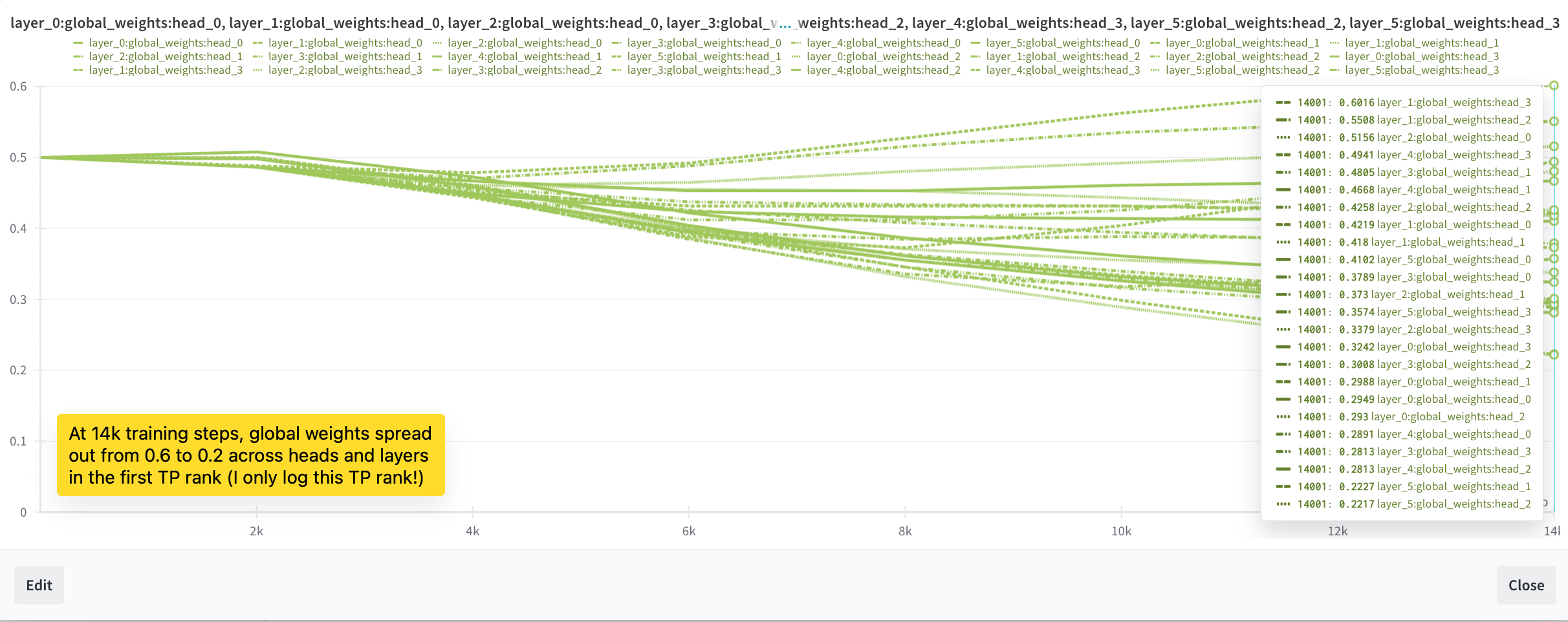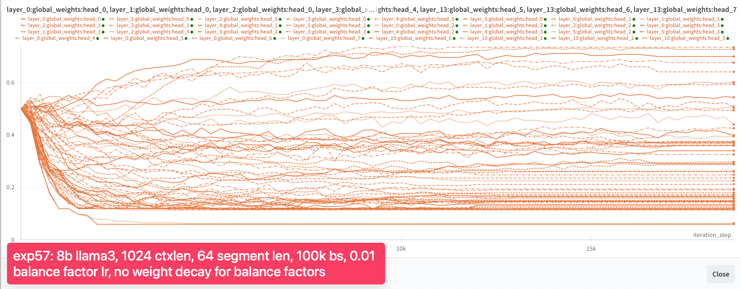 我们推测,无限注意力在全局权重分布于 0 到 1 之间时效果最佳,如论文中所述。给定上述权重,sigmoid([-0.03, 0.03]) = tensor([0.4992, 0.5008]),这与我们之前平衡因子约为 0.5 的实验结果一致。接下来,我们计划对平衡因子使用更高的学习率 (其他所有参数使用 Llama 3 8B 的学习率),并增加训练步骤数,使平衡因子至少变化 4,以便在梯度下降需要时,全局权重能达到理想值 (sigmoid(-4) ≈ 0,sigmoid(4) ≈ 1)。