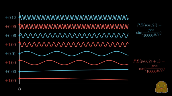 乍看之下,这些公式中有些部分可能会让人困惑。例如,作者为什么选择 10,000?为什么我们要对偶数和奇数位置分别使用 \sin 和 \cos?