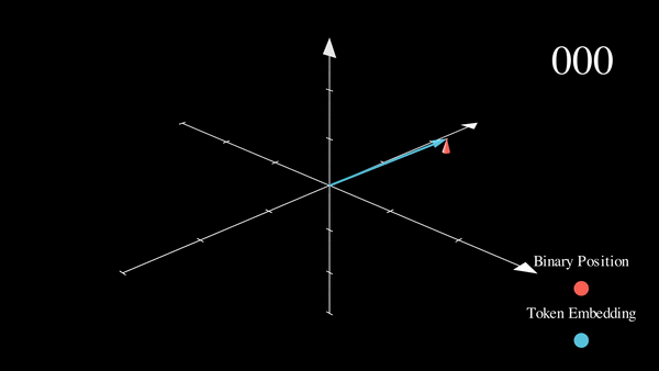 我们已经将感兴趣的位置信息 (252) 转换为其二进制表示 (11111100),并将每一位加到词元嵌入的相应分量中。最低有效位 (LSB) 将在每个后续词元中在 0 和 1 之间循环,而最高有效位 (MSB) 将在每 2^{n-1} 个词元中循环,其中 n 是位数。你可以在下面的动画中看到不同索引的二进制位置编码向量 [^1]。