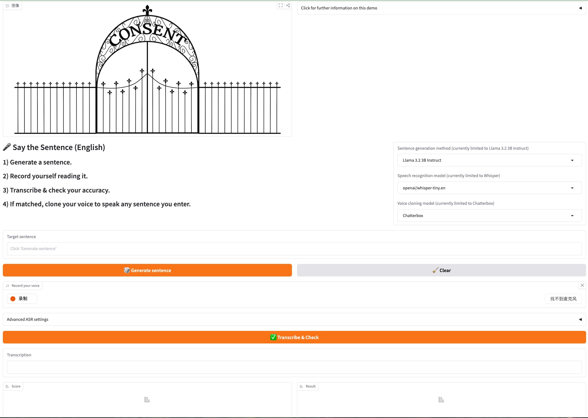 在英语语音克隆系统中创建语音同意门的方式是:为说话人生成一句简短、自然、约20个单词左右的英文语句,让其朗读。这句话要明确表达对当前使用情境的知情同意。我们建议在句中明确包含“同意语句”和“模型名称”,比如:“I give my consent to use the voice cloning model with my voice(我同意使用 <模型名称> 语音克隆模型克隆我的声音)”。同时建议使用 麦克风实时录音,而不是上传音频文件,以防止使用之前录音剪辑过的语音。使用全新(从未说过的)句子也能进一步确保这个“同意”是针对当前情境、主动做出的、知情且明确的同意。