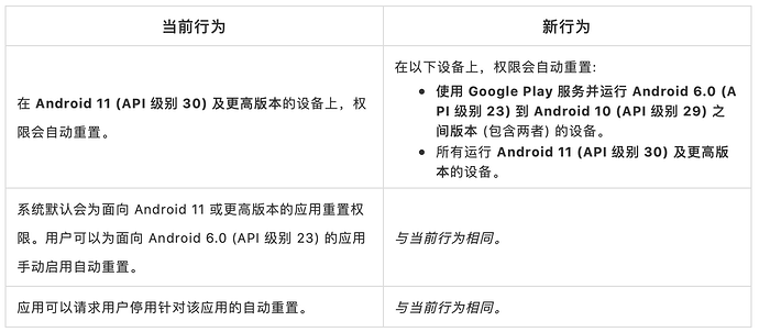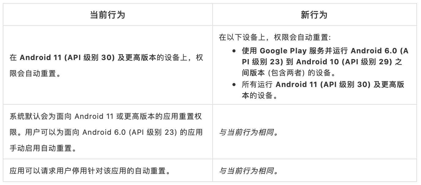 注: 此 API 仅适用于 targetSDK 为 API 30 或更高版本的应用,因为仅这些应用具有权限自动重置。如果应用的 targetSDK 为 API 29 或更低版本,则开发者无需进行任何更改。