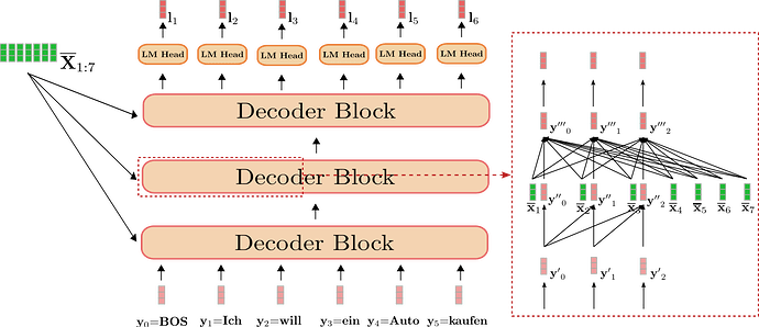 我们可以看到解码器将 Y0:5: “BOS”、“Ich”、“will”、“ein”、“Auto”、“kaufen” (图中以浅红色显示) 和 “I”、“want”、“to”、“buy”、“a”、“car”、“EOS” ( 即 X1:7 (图中以深绿色显示)) 映射到 logit 向量 L1:6 (图中以深红色显示)。