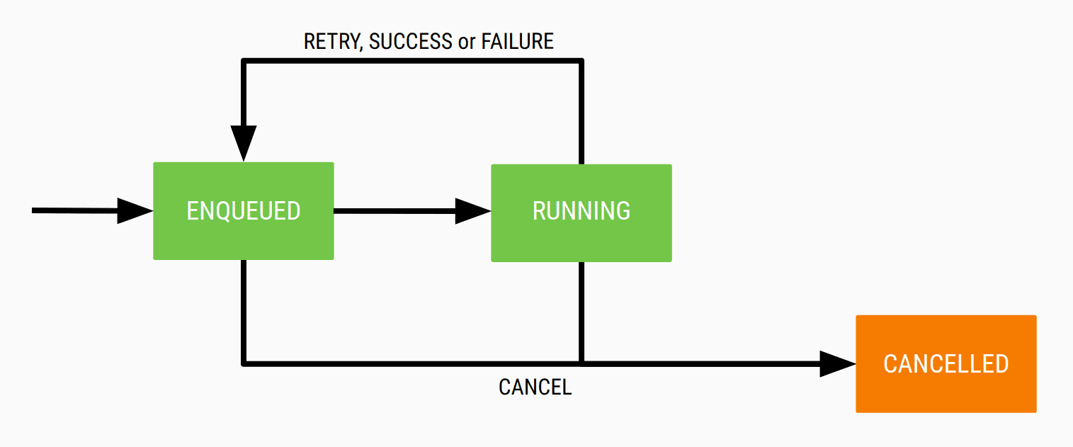周期性任务不会以 SUCCEEDED 状态结束,它会持续运行直到被取消。当您在周期性任务的 Woker 中调用 Result#success() 或 Result#failure() 时,周期性任务会回到 ENQUEUED 状态并等待下一次执行。